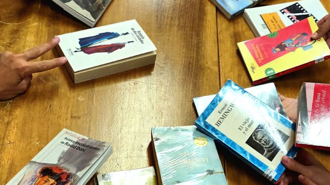 La proposta va ser magníficament acollida pels assistents −un regal sempre és  benvingut− i, al poc de començar, els conductors van escampar pel cim de la taula central de  la biblioteca els volums que s’havien seleccionat per a aquesta sessió inicial; van fer una  petita presentació d’alguns d’ells, una pinzellada introductòria als autors i a les obres i, a  continuació, tothom va poder escollir el títol que li semblava que més el podia engrescar:  clàssics com Història de dues ciutats, novel·les de detectius amb misteris a resoldre com El  club Dante, reportatges d’actualitat com La noia de Portbou, novel·les juvenils com La maldición del brujo leopardo, antologies de relats, peces teatrals, Veinte poemas de amor y  una canción deseperada, Mecanoscrit del segon origen